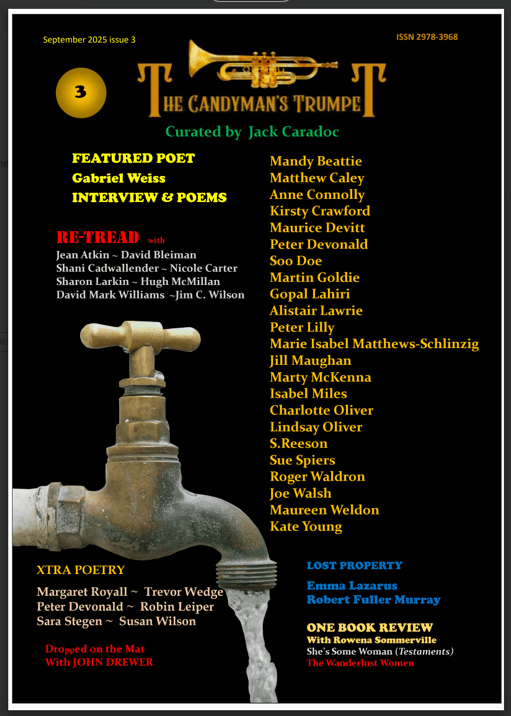 I was very pleased that my poem ‘Flight Recorder’ which won first prize in The Black Box competition in Jack Caradoc’s Dreich magazine in 2022 featured again as a ‘Retread’ in Issue 3 of his new magazine, The Candyman’s Trumpet, in September 2025.  A big ‘thank you’ … twice … to Jack Caradoc.
