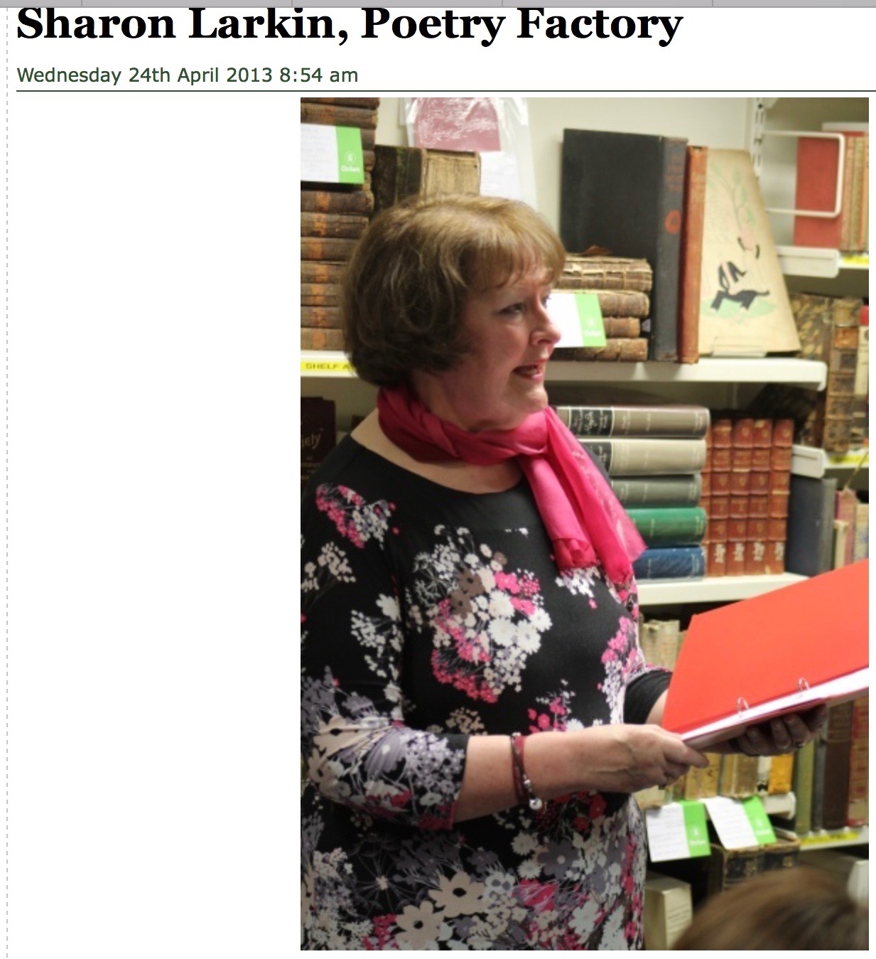- Reading with Poetry Factory April 2013: “Sharon Larkin, who has a poem in the recent Heart Shoots anthology, was fascinated by science, particularly chemistry and physics, as well as the “shamans and charlatans” who whip up apocalyptic fear”. Write Out Loud – Review of reading with Poetry Factory