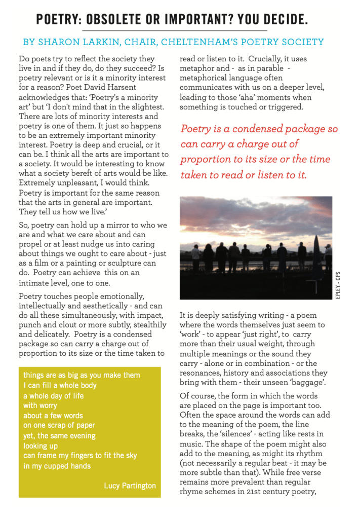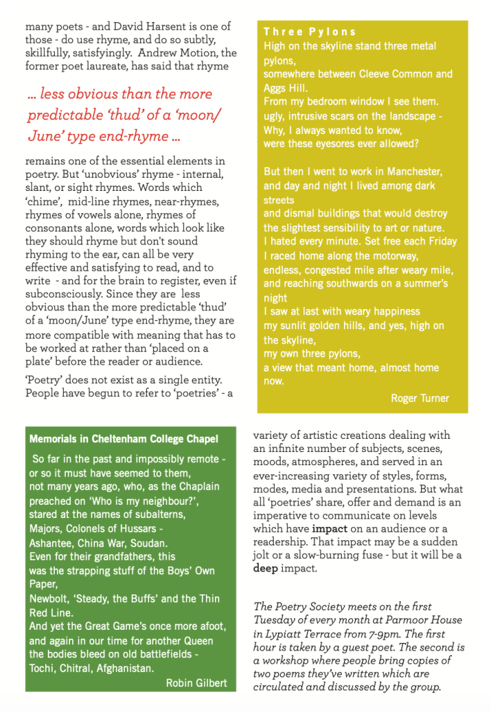 February- May 2017 – Item on Cheltenham Poetry Society’s Anthology ‘Cheltenham 300’ and poems from three members of the Society:
