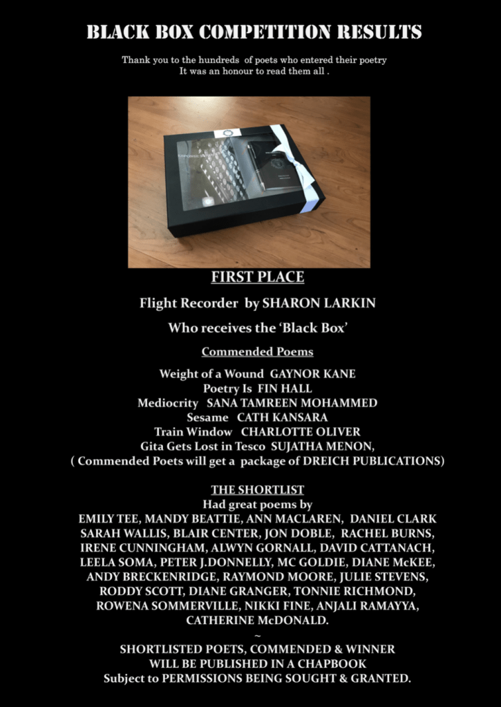Poem ‘Flight Recorder’ won first prize in the Black Box Competition from Dreich Publishing in March 2020 and was included in the Black Box prizewinners’ anthology: