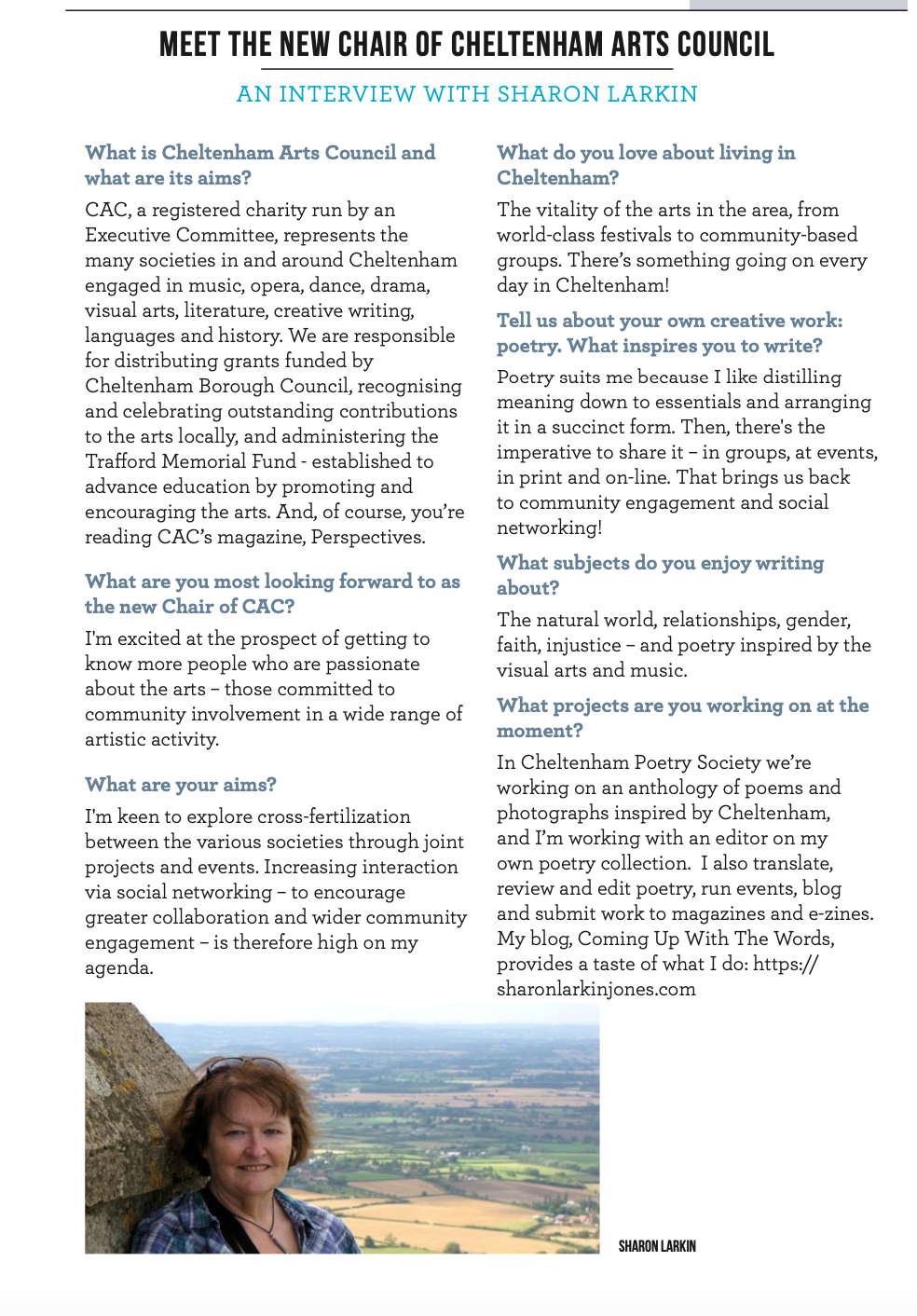 Perspectives magazine for Feb – May 2015 carried two of my poems, before I became Chair of Cheltenham Arts Council. They were ‘Taddington, January’ and ‘Cactus Bowl’ – readable here: