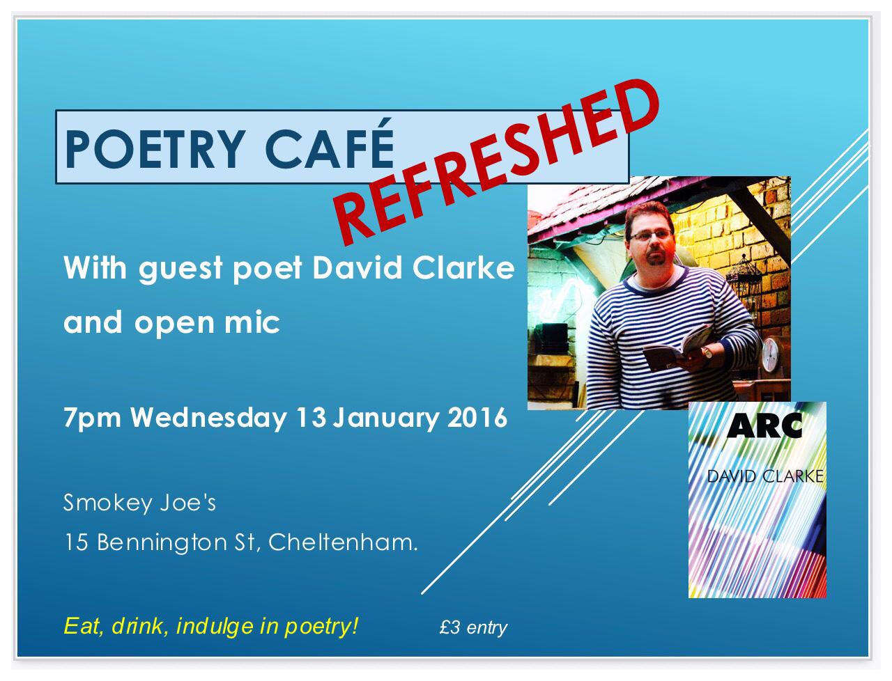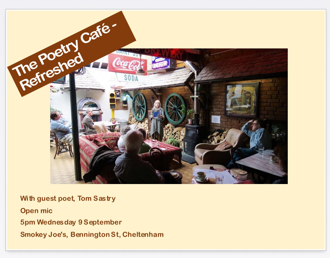 July marks the second birthday of Poetry Café – Refreshed, held on the third Wednesday of every month at Smokey Joe’s in Cheltenham.  We are looking forward to celebrating our continuing run of fine poetry from gifted poets – welcoming David J Costello as our guest poet on Wednesday 19 July.